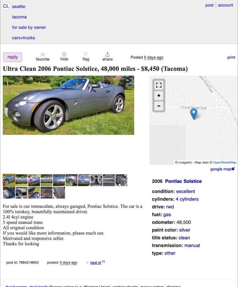 What do you assume? Is that this Solstice the proper selection? And is that $8,450 the proper worth? Or does the automotive and the asking point out darkish days forward?
